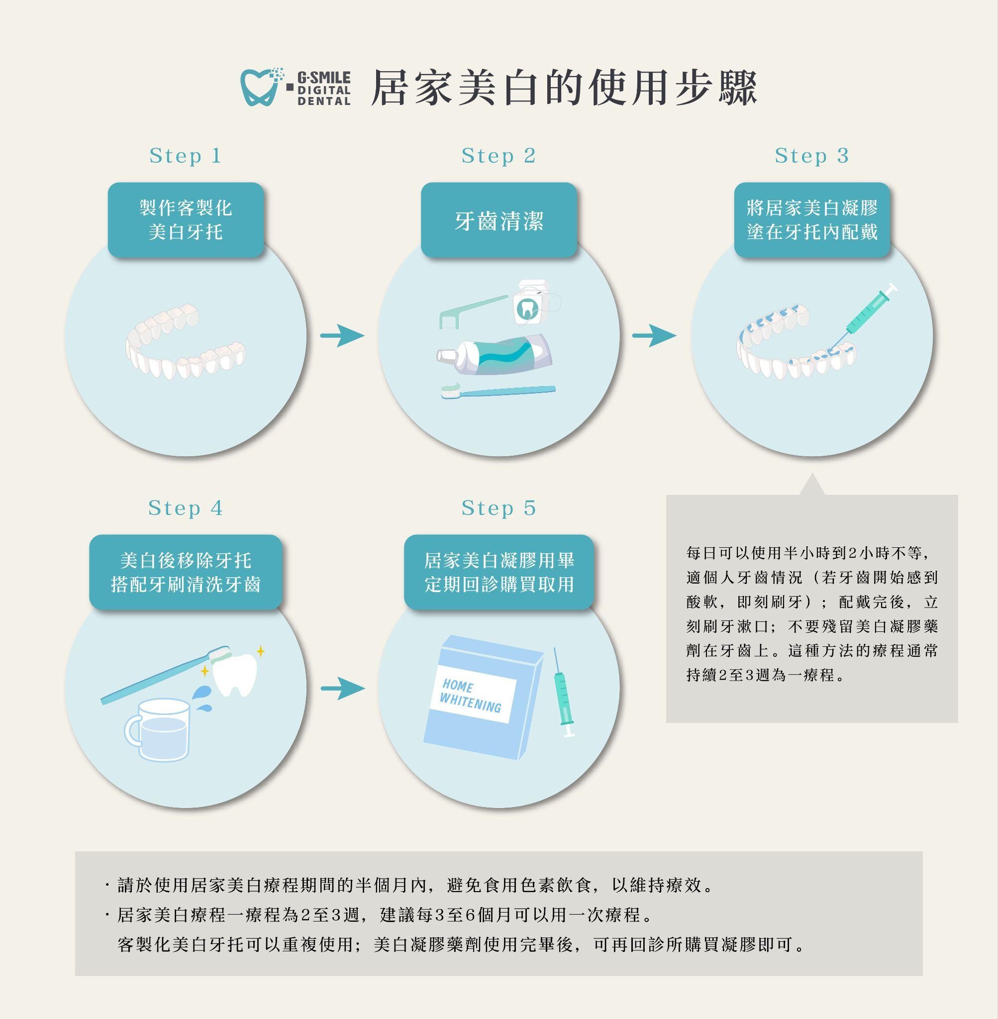 *貼心提醒:在進行G-Smile冷光美白療程時,牙醫師通常會建議搭配使用居家美白療程,以延長美白效果的持久性。冷光美白能夠迅速提升牙齒的亮白度,而居家美白則可以在此基礎上進一步鞏固和延續美白效果!
