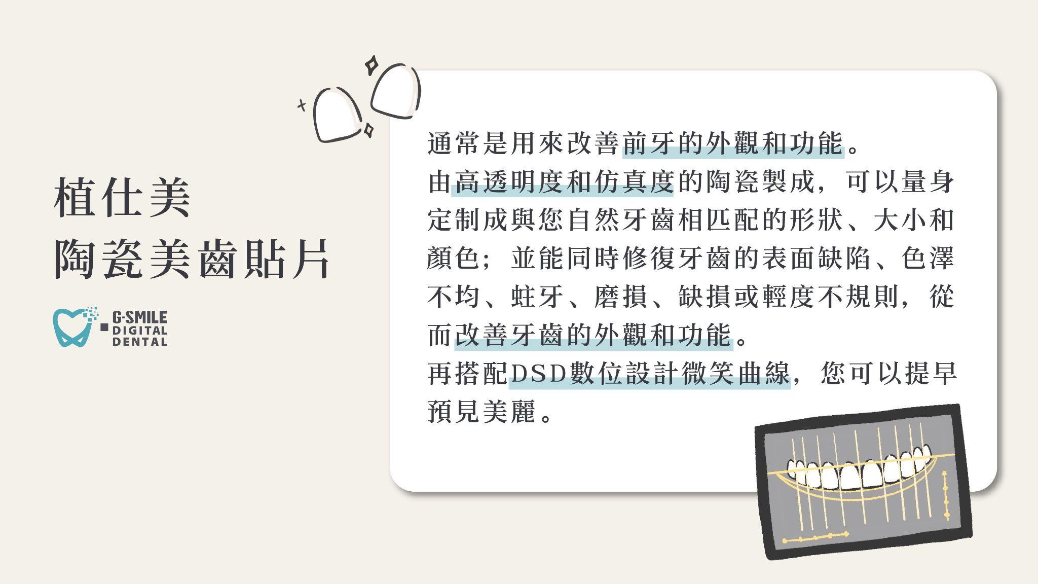 陶瓷美齒貼片通常是用來改善前牙的外觀和功能。它們由高透明度和仿真度的陶瓷製成,可以量身定制成與您自然牙齒相匹配的形狀、大小和顏色;並能同時修復牙齒的表面缺陷、色澤不均、蛀牙、磨損、缺損或輕度不規則,從而改善牙齒的外觀和功能。再搭配DSD數位設計微笑曲線,您可以提早預見美麗。