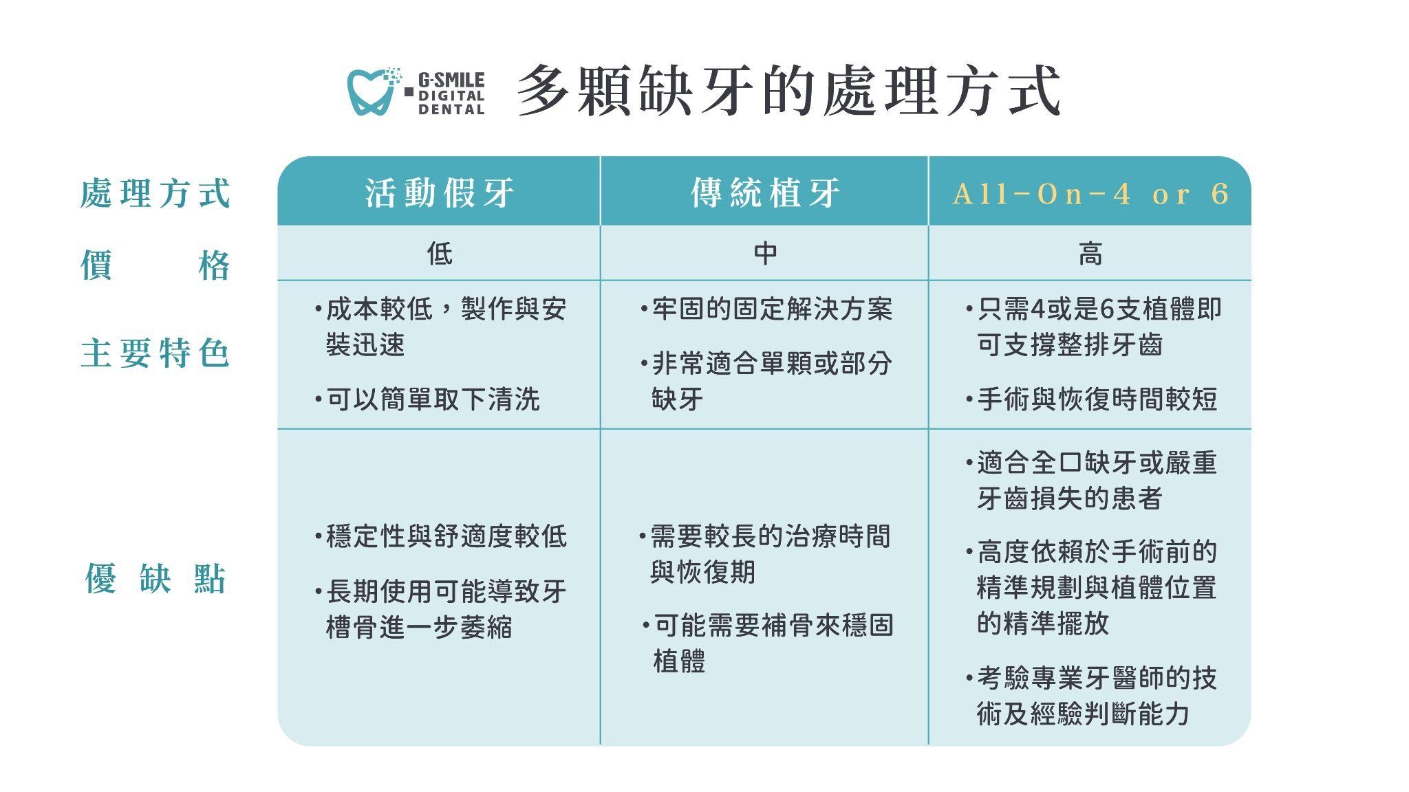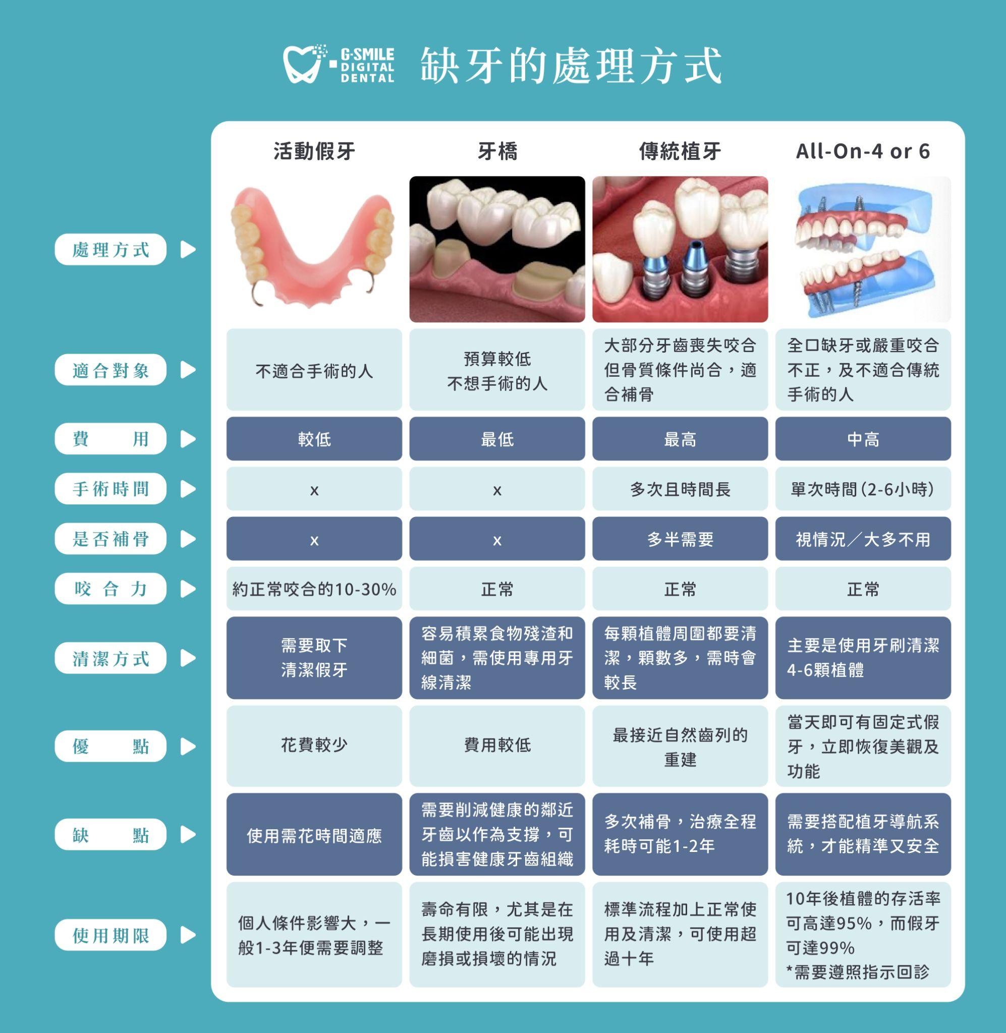*貼心說明:常見的全口重建處理方式有「活動式假牙」、「固定式假牙」「固定式全口傳統植牙」及「All-On-4 or 6」。
