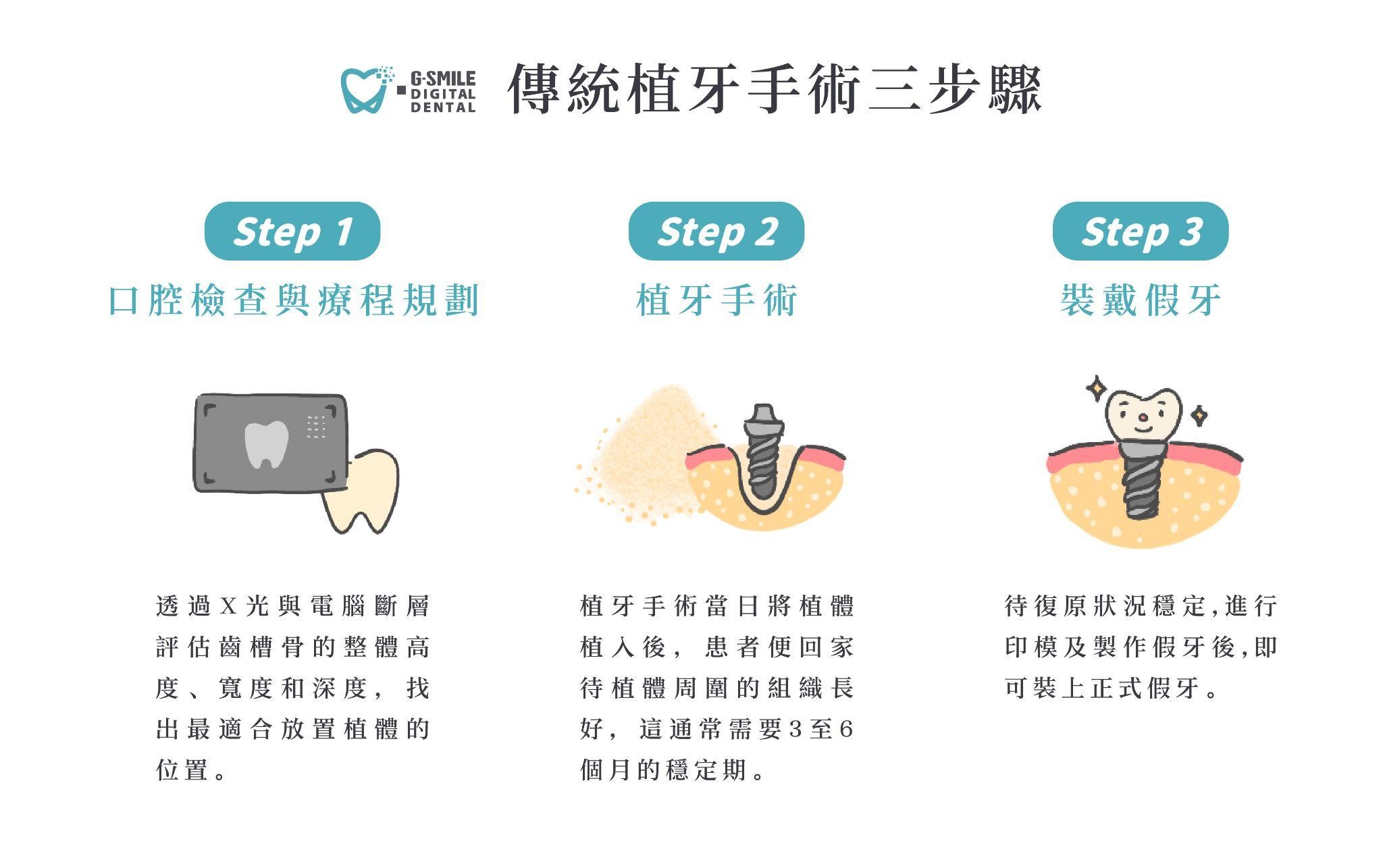 植牙手術當日牙醫師會植入人工牙根(植體)並請患者等待癒合;植體植入後,待植體周圍的組織長好,一般需要3至6個月的穩定期。