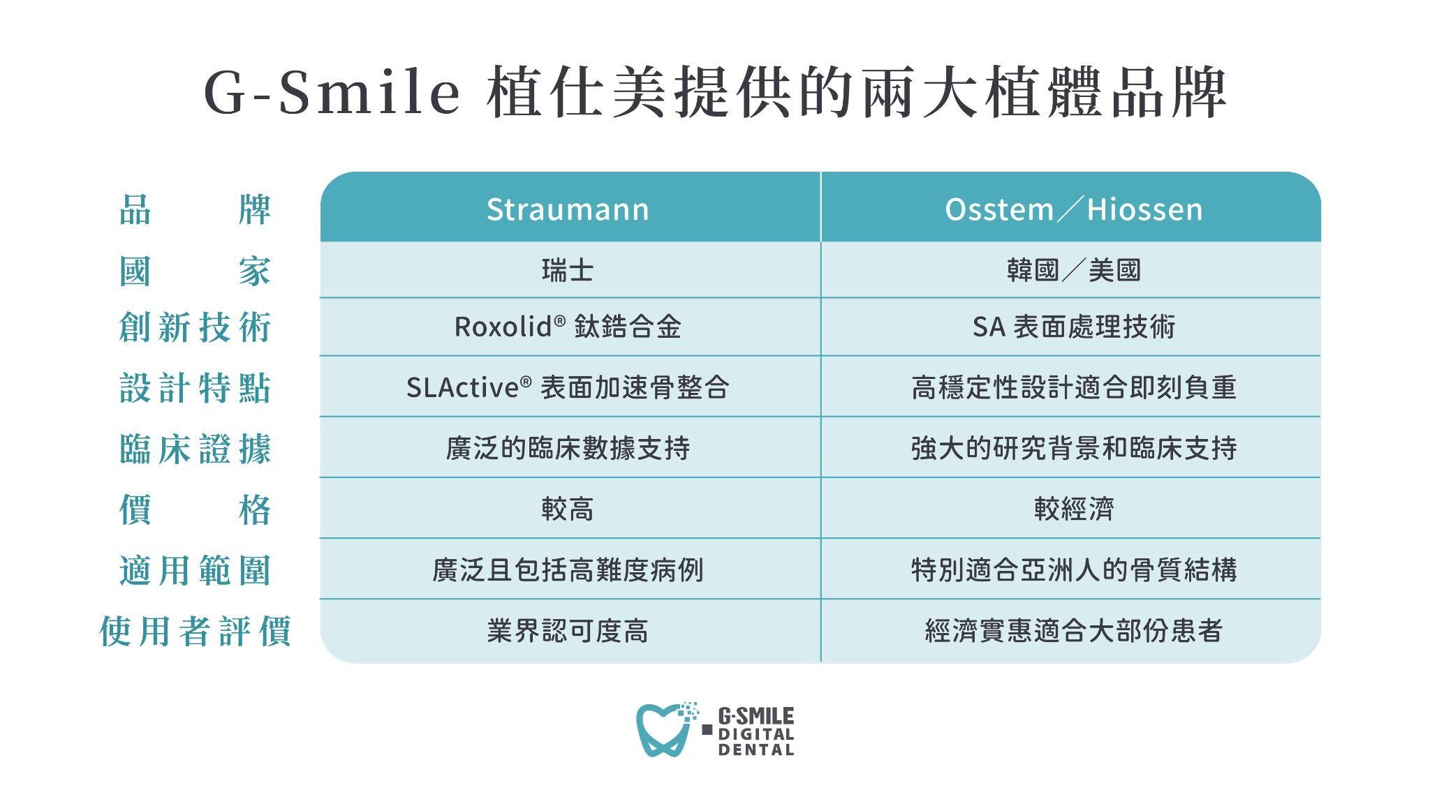 G-Smile植仕美提供的兩大傳統植體品牌:Straumann, 和 Hiossen(Osstem美規品牌)