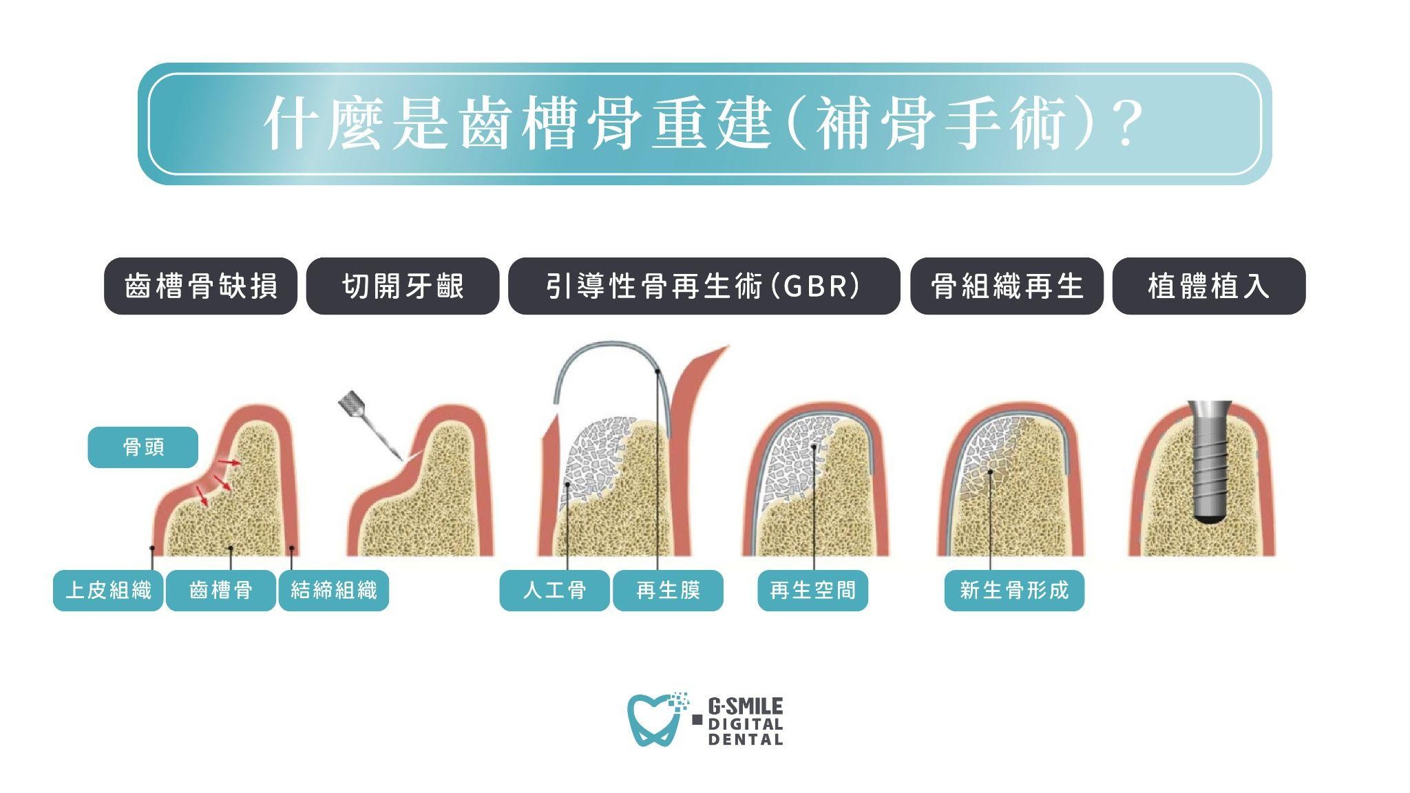 當牙齒缺失或受損拔除時,周圍的牙槽骨可能會吸收或萎縮,這對植牙或其他修復過程造成挑戰;因植體需要足夠的骨頭來安全地植入並融合。這時候就需要齒槽骨重建手術(補骨手術),來重建缺失或受損的牙槽骨,為植牙或其他牙齒修復提供足夠的支撐和穩定性。