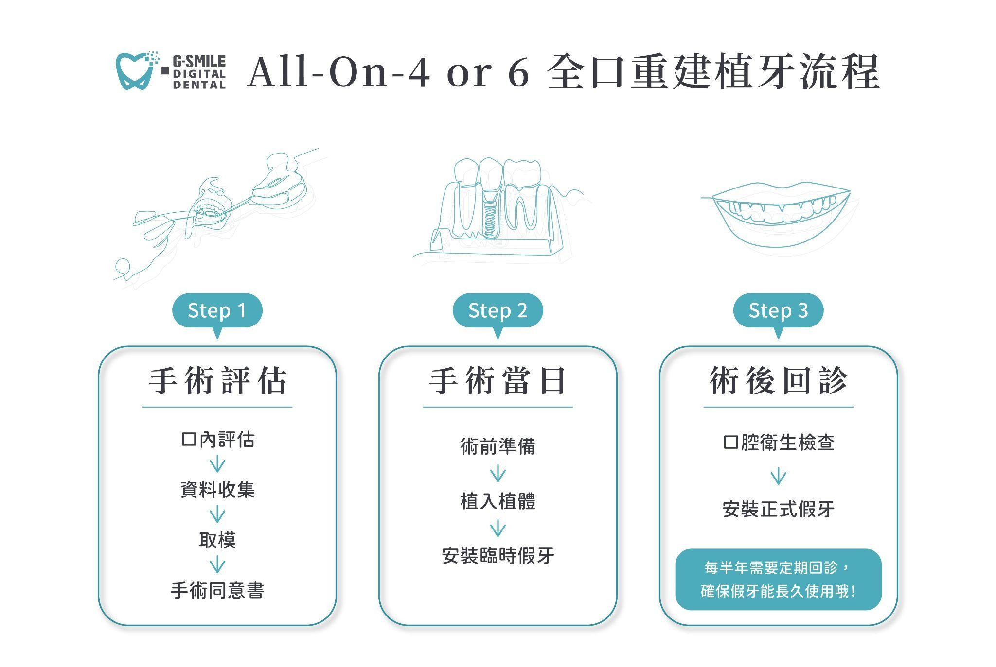 手術當日,醫師會進行必要的術前準備工作,然後執行All-On-4 or 6植入手術。