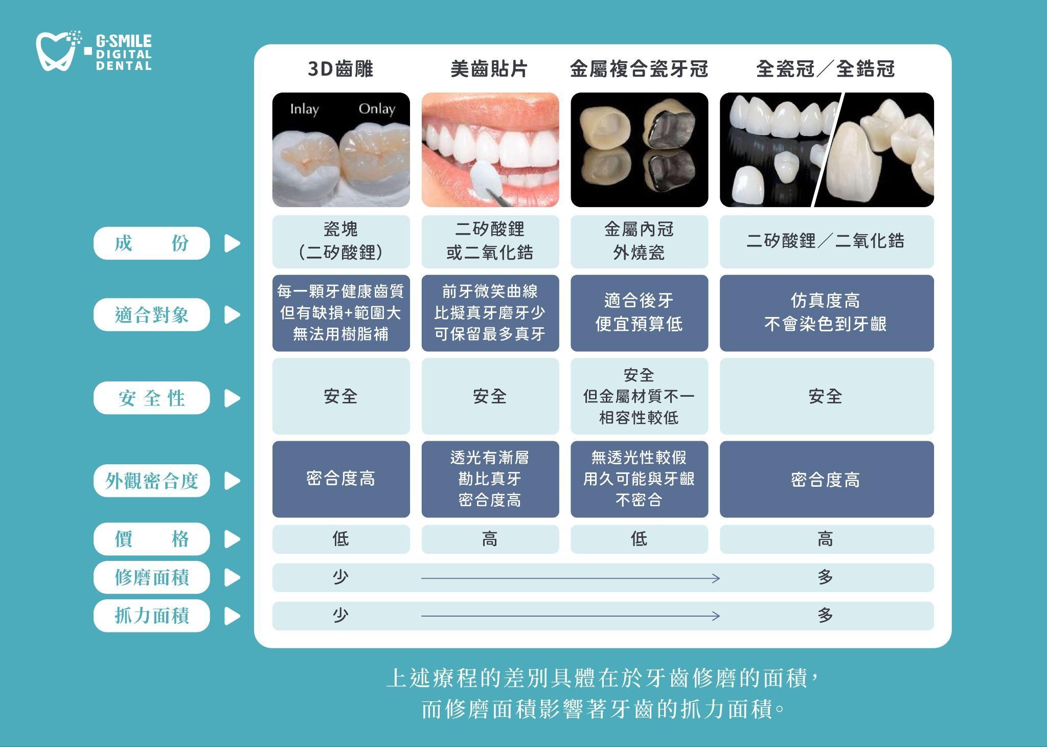 *貼心說明:幾個治療方案的差別在於牙齒修磨的面積,而修磨面積也影響著牙齒的抓力面積;抓 力面積越大,贗復物越不容易破裂。