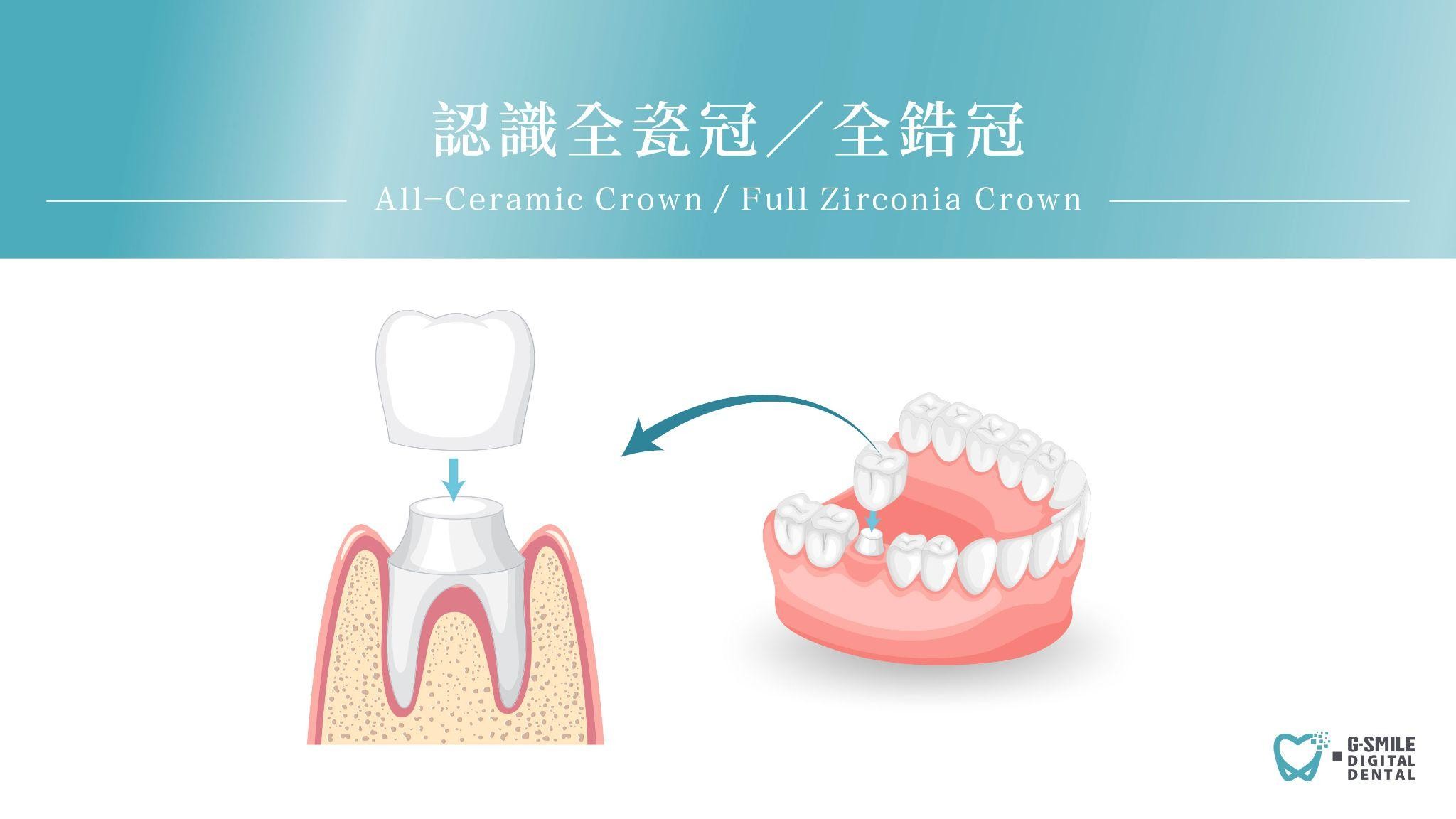 全瓷冠跟全鋯冠是固定式假牙材質的一種,兩種差別只在於陶瓷材質的堅硬度;兩者皆因不含金屬而在近年來被廣泛使用。因其導熱性低於金屬冠,對牙齒內的牙髓保護更好,減少了冷熱刺激引起的不適,適合對金屬敏感的人群。
