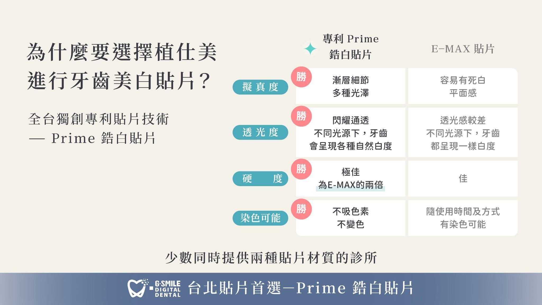 G-Smile植仕美是台北市少數同時有兩種貼片材質供患者選擇的診所。 - 獨家專利技術Prime鋯白貼片的優越性: