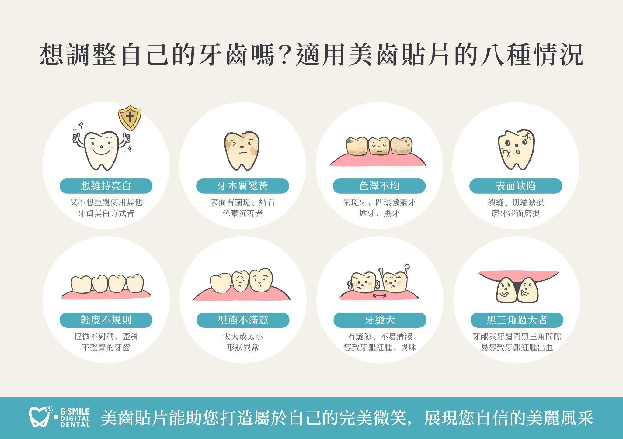 - 美齒貼片:主要用於改善牙齒外觀,如顏色、形狀或大小,牙縫過大或齒列微不整齊等。